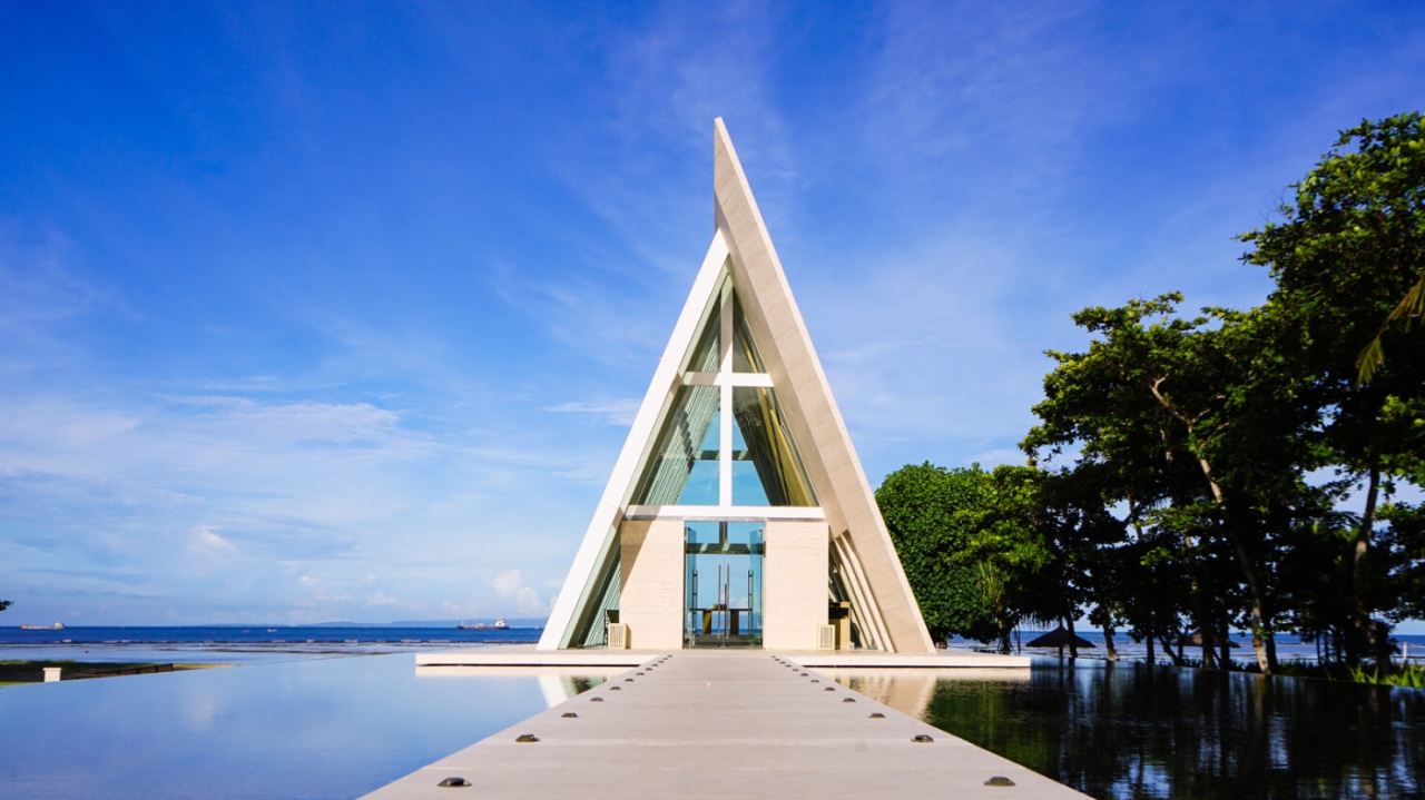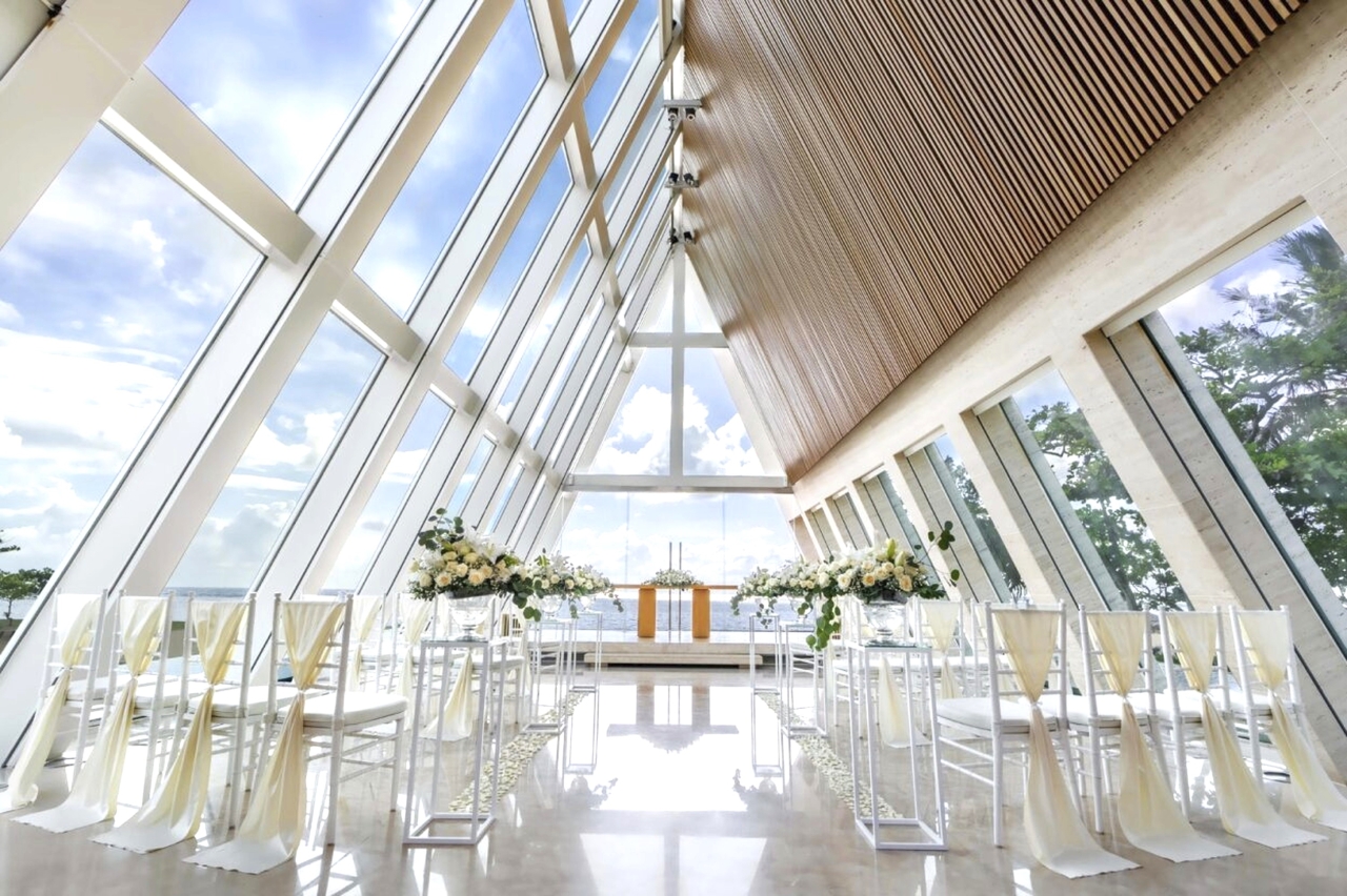 三角屋根の壮麗なガラス張りのビーチフロントチャペル